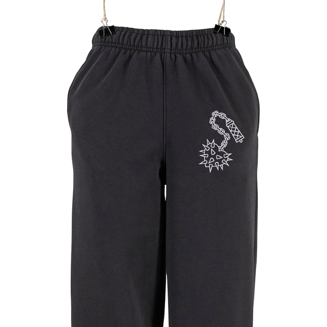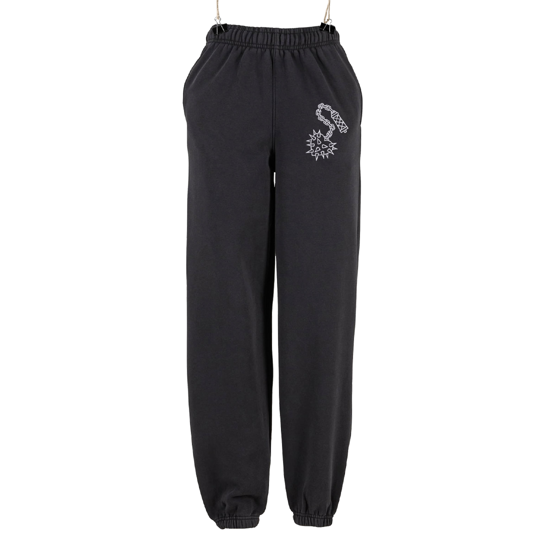 Vintage style, heavy sweatpants with elasticated waist, cuffed ankles, pockets and front, embroidered motif.