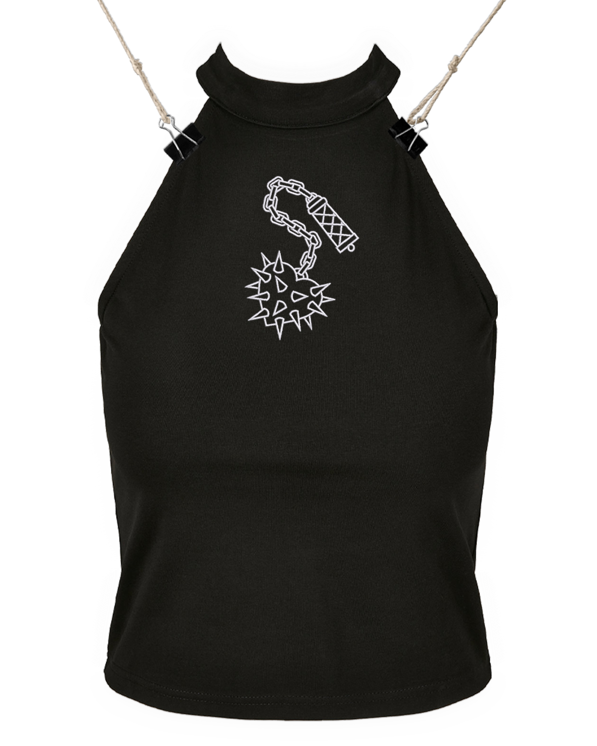 Racer back, high neck vest top in a cotton stretch fabric finished with a front print.